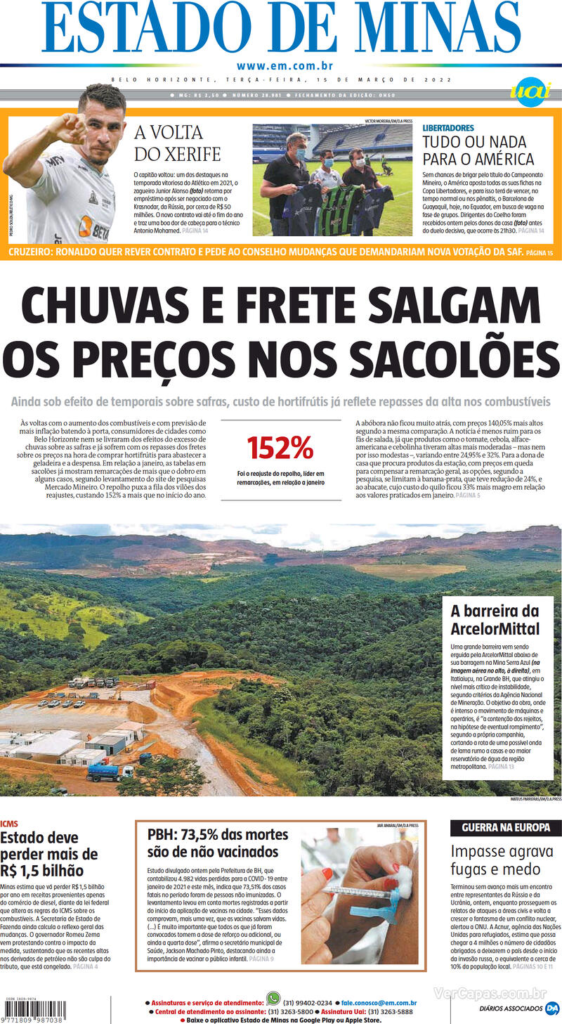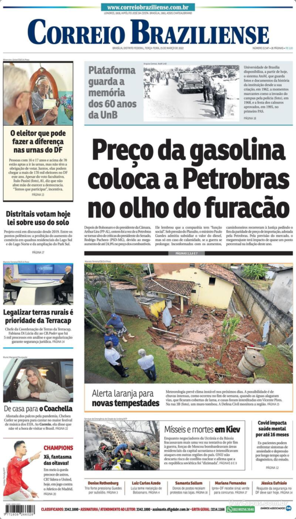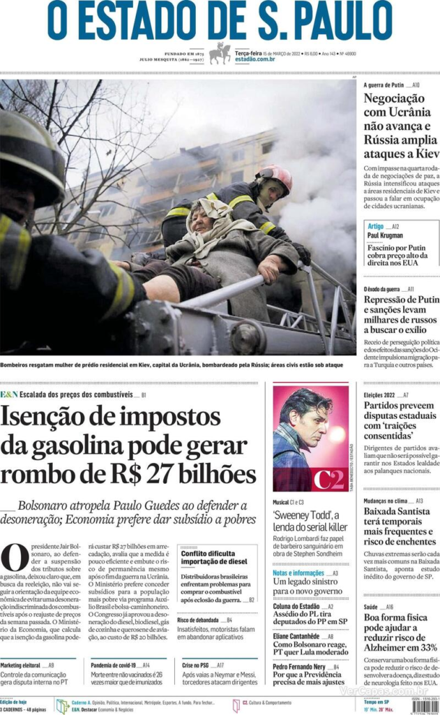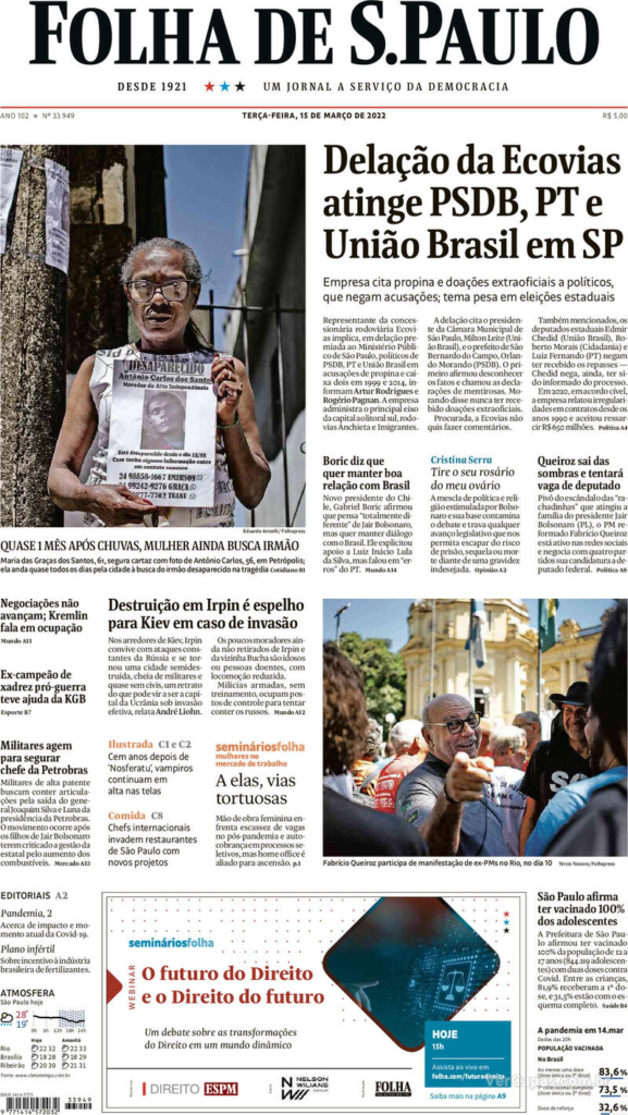 1. As manchetes dos principais jornais do país chamam para assuntos locais, nesta terça-feira. A Folha fala sobre delação da Ecovias, que pode atingir PSDB, PT e União Brasil em São Paulo. O Estadão e o Globo trazem informações sobre a queda de braço no governo quanto ao subsídio aos combustíveis.