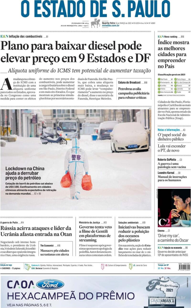 O Estadão destaca a polêmica sobre os preços dos combustíveis. Bolsonaro continua insistindo que a Petrobras deve baixar os preços, mas o ministro de Minas e Energia, Bento Albuquerque disse que vai manter o presidente da estatal. Ele quer novo imposto sobre os combustíveis, como destaca O Globo.
