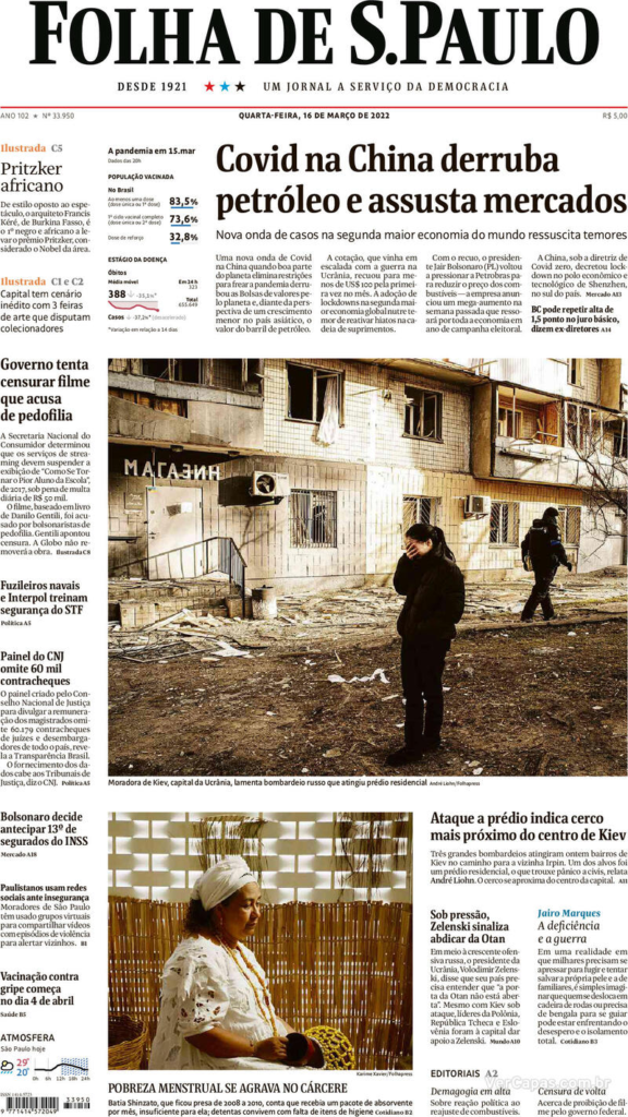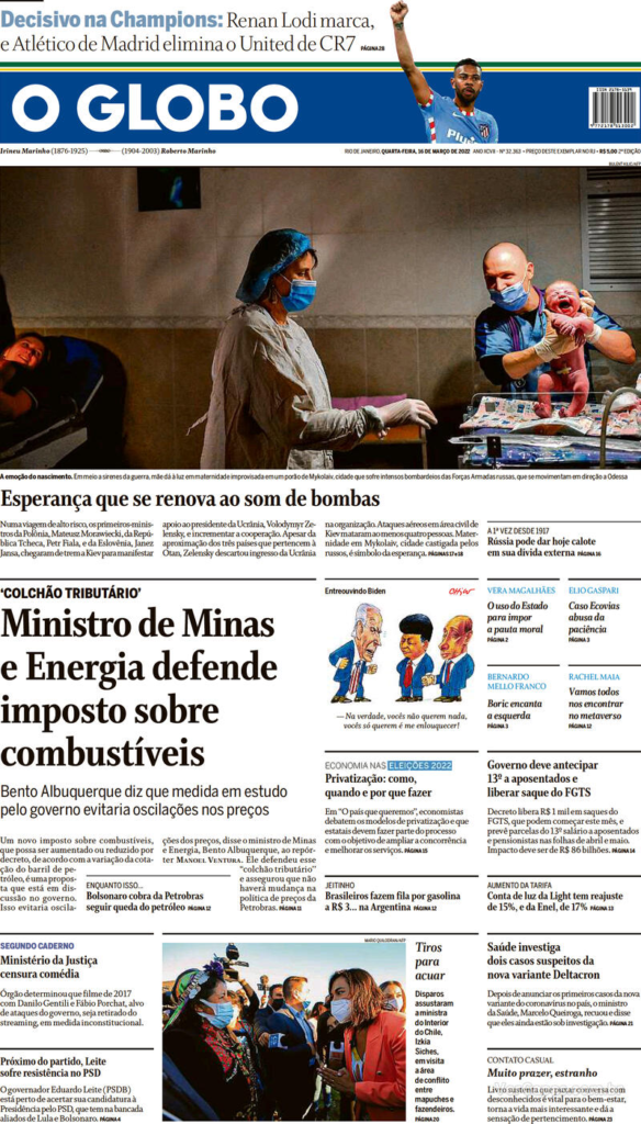 As capas dos jornais desta quarta-feira dão mais peso a questões internas do que à guerra na Ucrânia, mas que continua presente. A Folha traz uma foto de destruição provocada por ataques russos e O Globo traz o nascimento de uma criança naquele país, como símbolo de esperança.