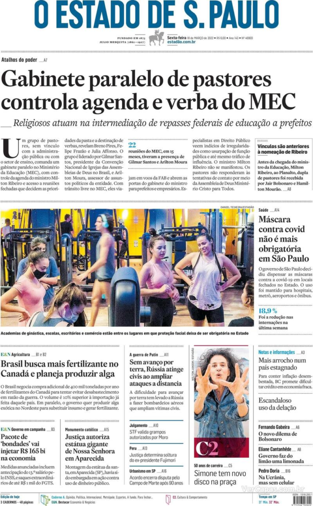 4. O Estadão dá como manchete o uso do MEC por entidades religiosas. Segundo o jornal, pastores controlam a agenda e verba do MEC.