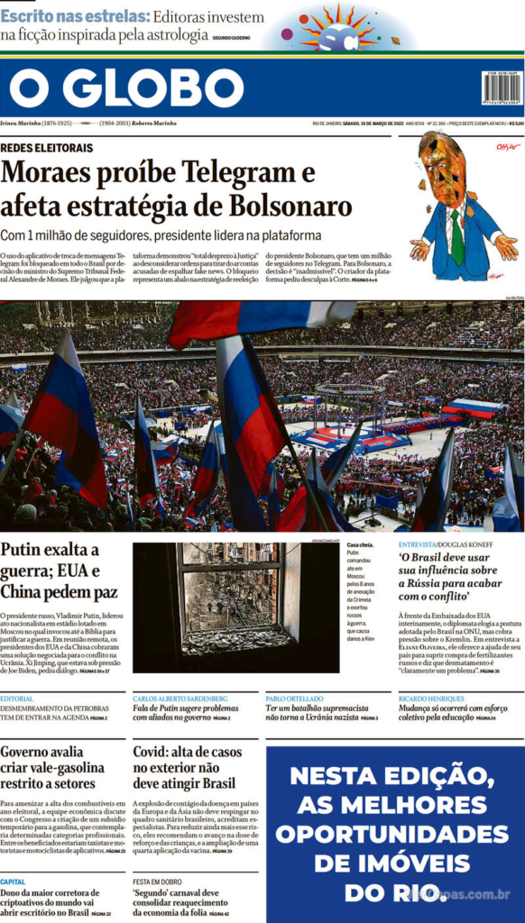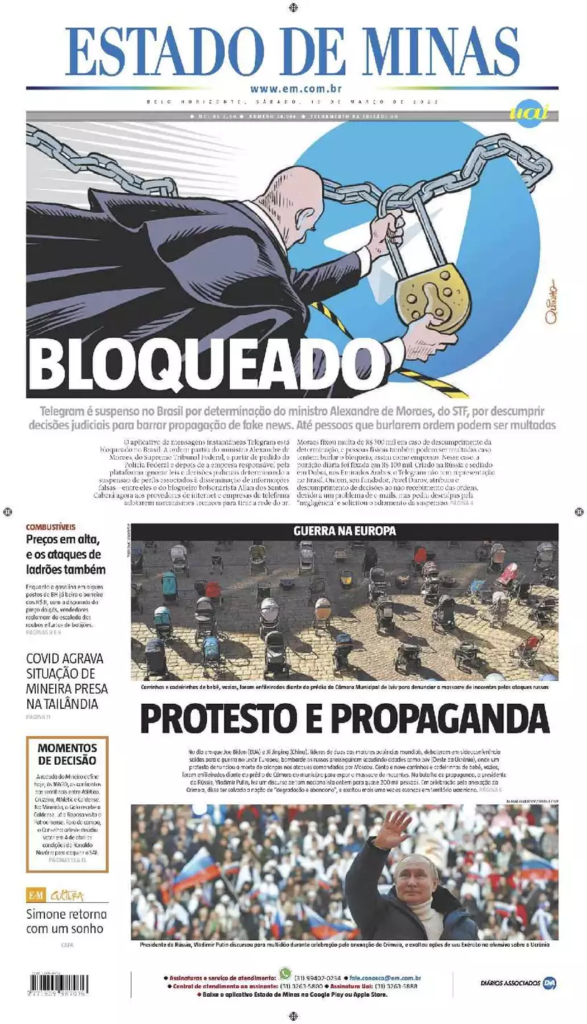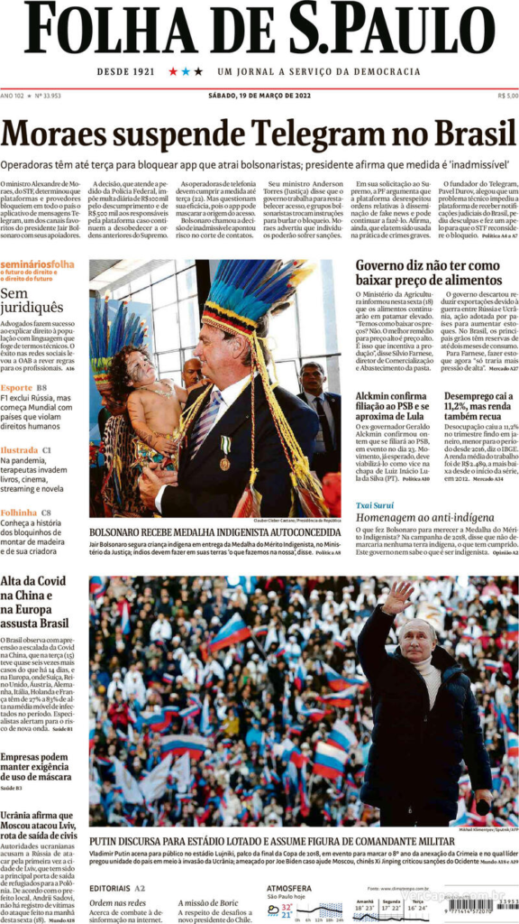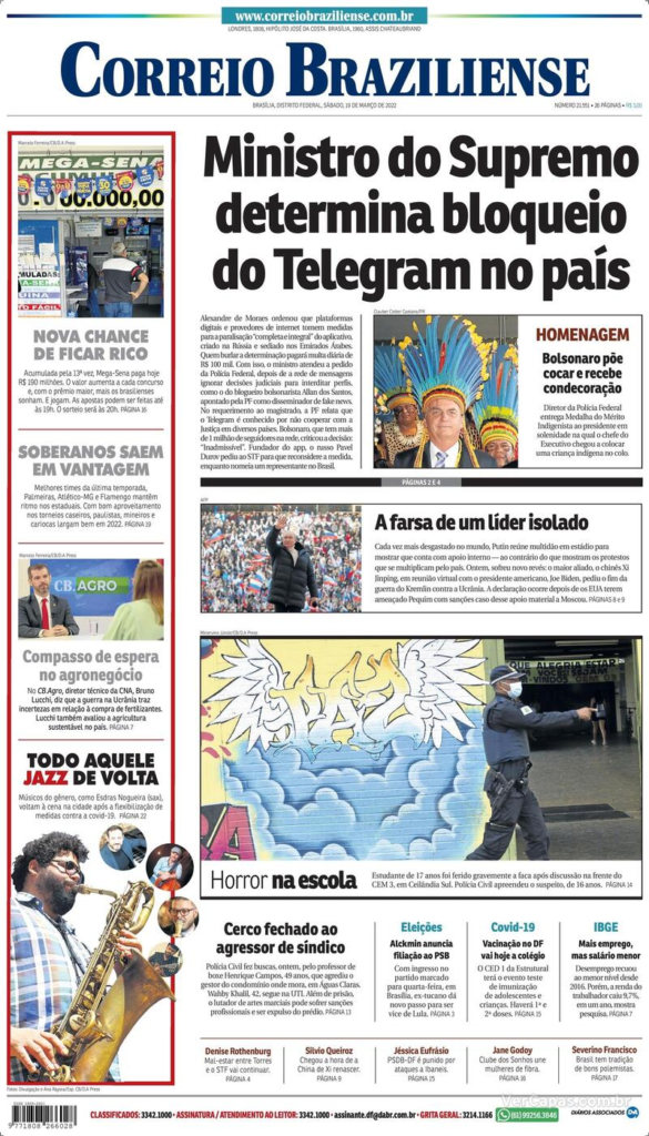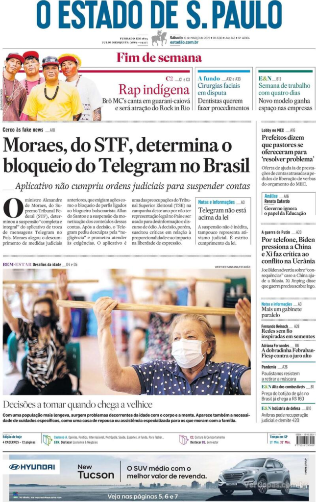 A suspensão da plataforma Telegram no Brasil pelo juiz Alexandre de Moraes, do STF, está na manchete dos principais jornais do país neste sábado.