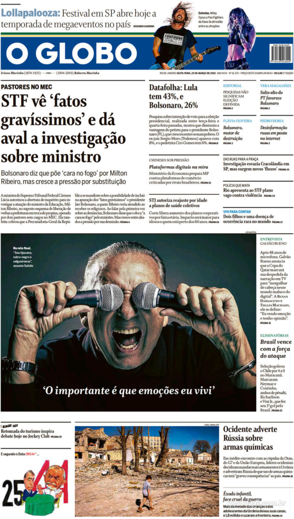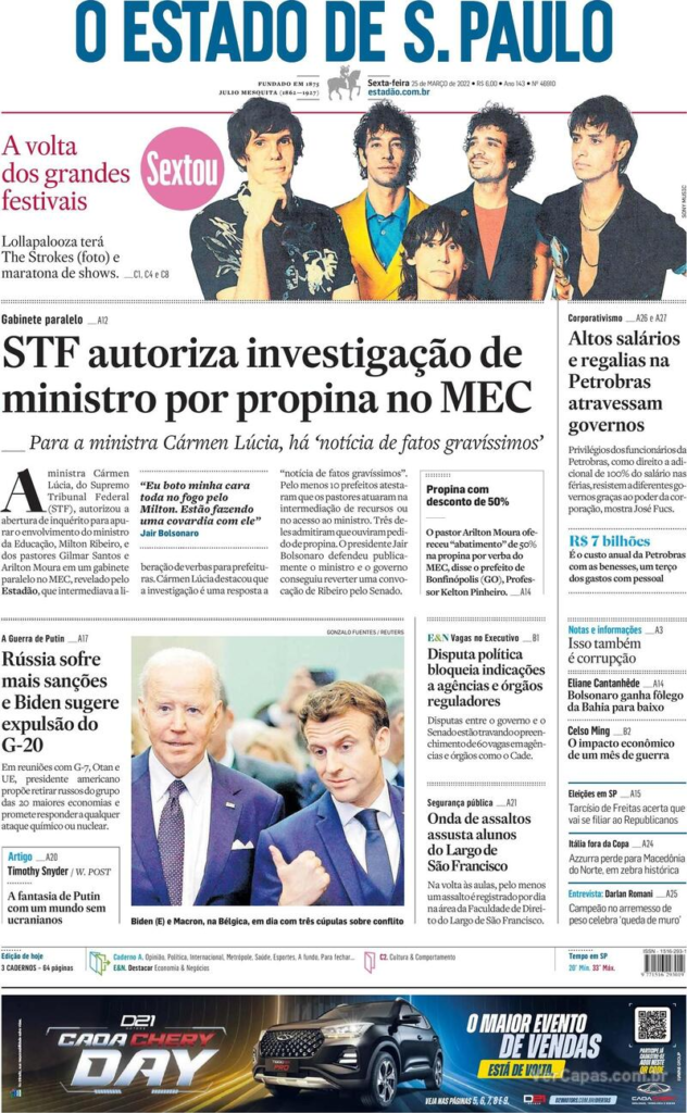 O STF autorizou investigação por propina no Ministério da Educação, destacam os jornais na edição desta sexta-feira. Para a ministra Carmem Lúcia houve ‘fatos gravíssimos’. O ministro Milton Ribeiro parece isolado, mas não há sinais de troca. Em live, Bolsonaro disse que bota ‘a minha cara no fogo’ pelo ministro.