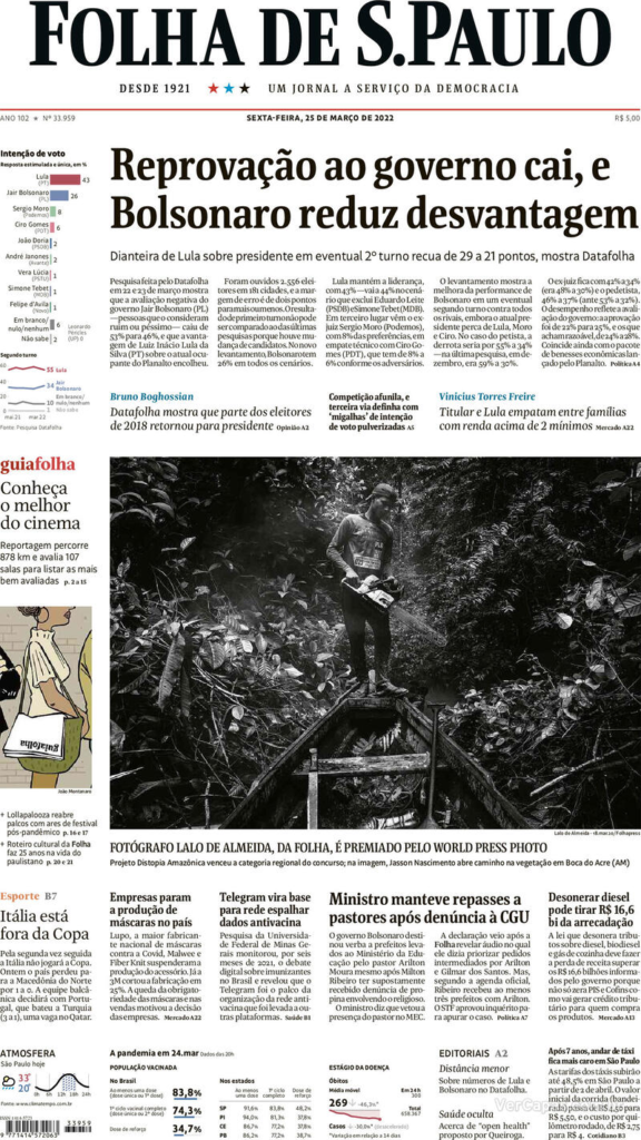 A Datafolha divulgou nova pesquisa eleitoral, mostrando o quadro estratificado. Lula lidera com folga (43%), mas Bolsonaro (26%) reduziu a desvantagem em relação ao petista. Moro e Ciro estão distantes dos líderes (8% e 6%). Pelos números atuais, haverá segundo turno.