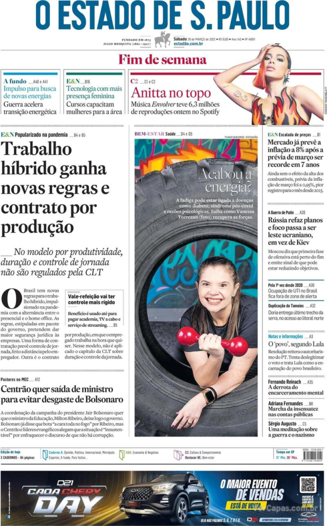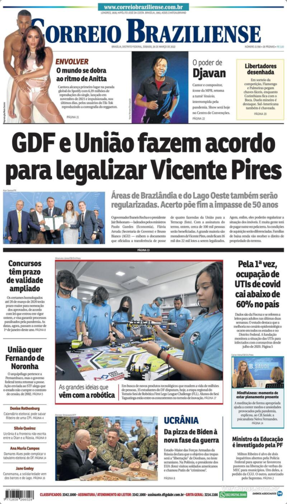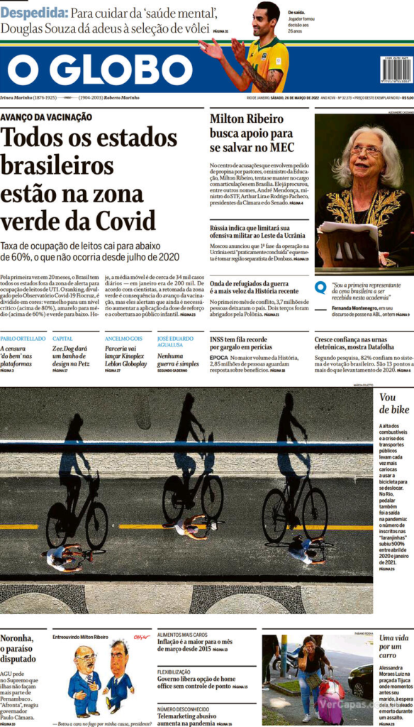 1. Pela primeira vez, desde o início da pandemia há dois anos, os hospitais estão na ‘zona verde’ da covid-19. Esse é um dos assuntos em destaque nos jornais deste sábado. Os dados da Fiocruz indicam que o avanço da vacinação permitiu o controle da doença.