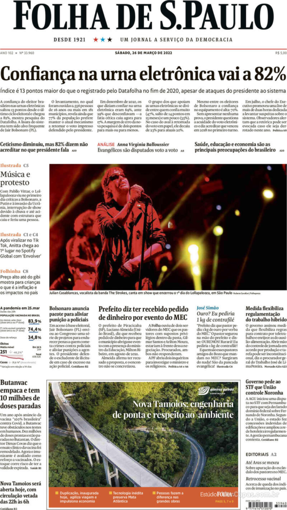 2. A Folha destaca que a confiança na urna eletrônica aumentou e chega a 82% da população. Os dados fazem parte da pesquisa Datafolha e mostram que os ataques ao sistema de votação só fortaleceu o mecanismo.