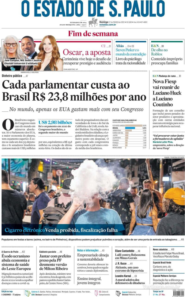 1. A guerra na Europa recebeu pouco destaque na capa dos jornais neste domingo. Sinal de que o assunto não teve desdobramentos relevantes nas últimas 24 horas e que tende a permanecer nas pautas dos jornais, mas com menos intensidade.