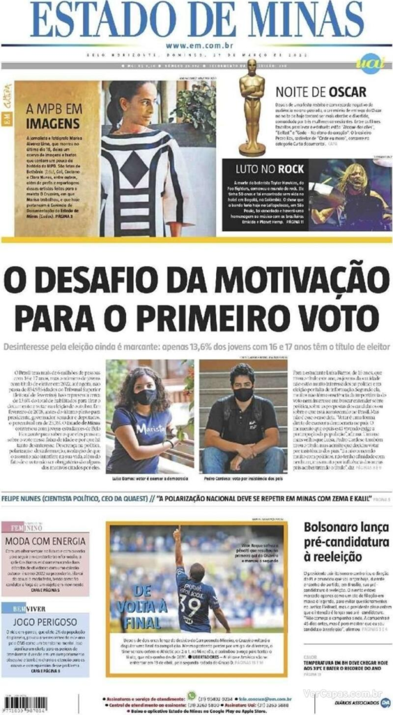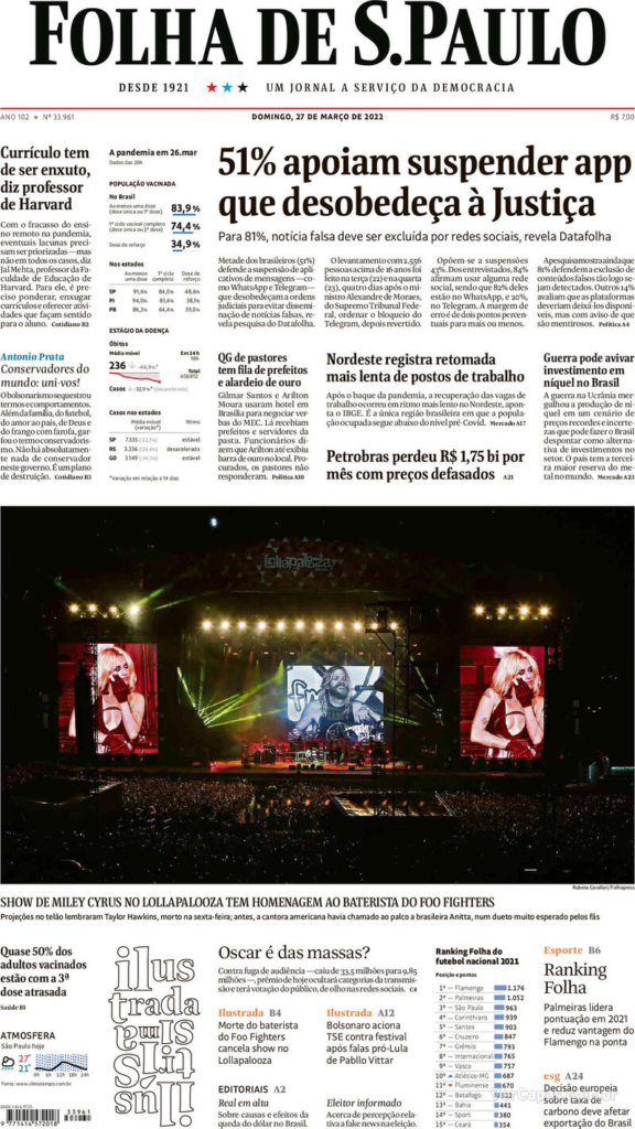 6. O destaque da Folha é sobre o processo eleitoral. Ainda com base em pesquisa do Datafolha, o jornal afirma que a população apoia medidas contra os aplicativos que desobedeçam à Justiça.