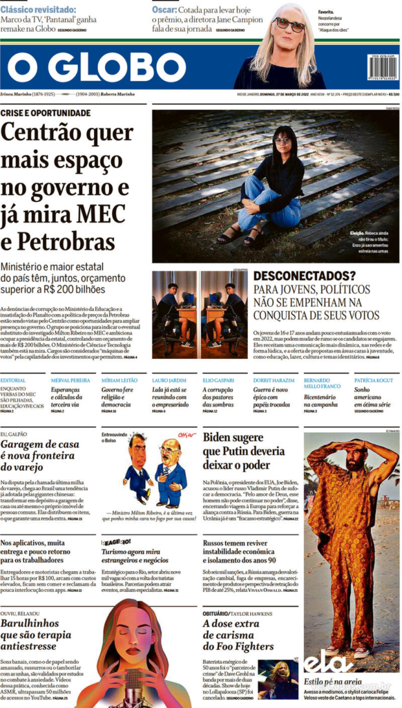 4. O principal destaque dos jornais neste domingo é a questão política interna, em várias dimensões. O Globo destaca que o Centrão quer mais espaço no governo e já mira MEC e Petrobras.