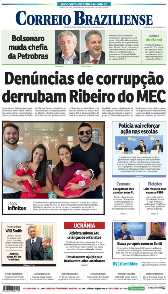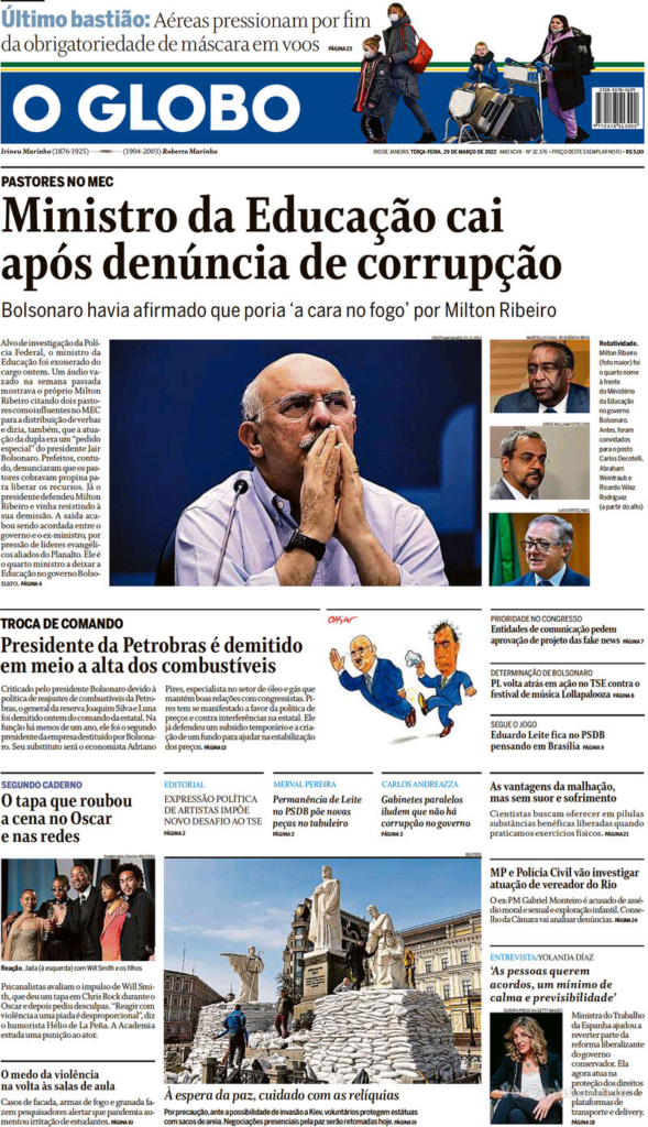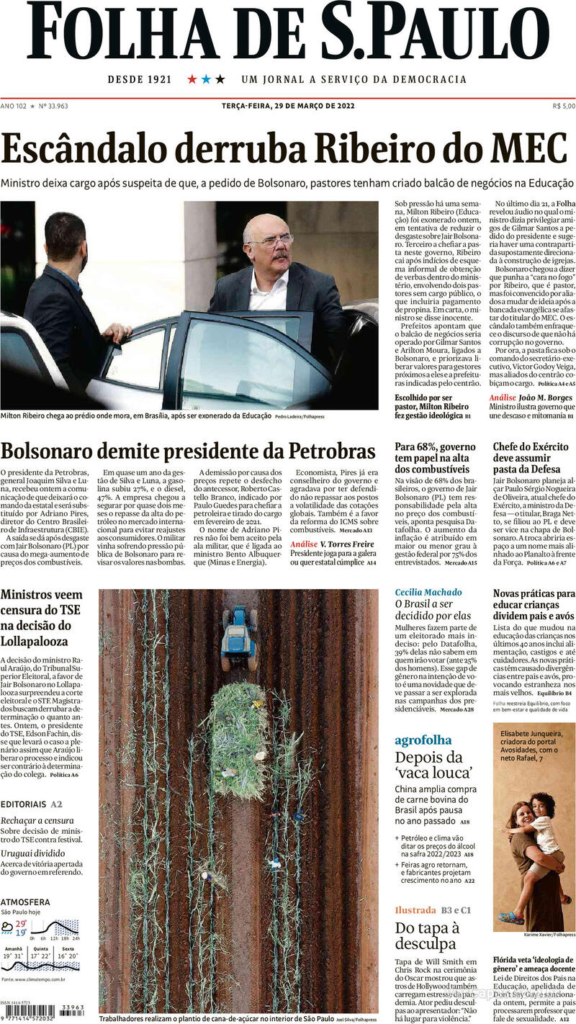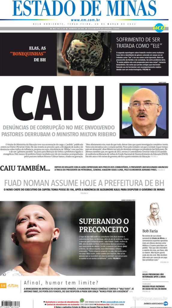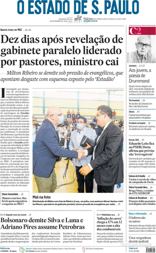 A queda do ministro da Educação, Milton Ribeiro, está na capa dos principais jornais do país nesta terça-feira. O ministro não resistiu ao escândalo dos pastores evangélicos que transformaram o ministério em um balcão de negócios intermediando verbas para as prefeituras. Bolsonaro teria optado por nomear o secretário-executivo como ministro. Líderes políticos começaram a veicular possíveis substitutos.