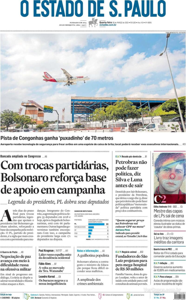 O Estadão mostra que Bolsonaro reforçou as suas bases com o troca-troca nos partidos políticos. O PL é a legenda que deve ganhar mais adesões.