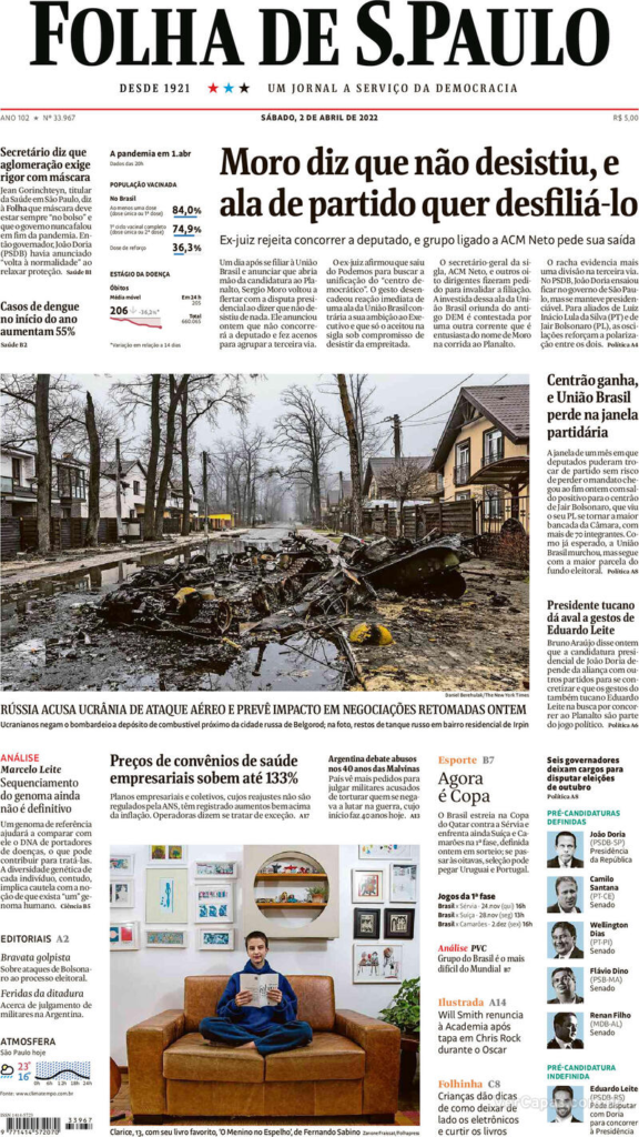 As idas e vindas dos presidenciáveis Sérgio Moro e João Dória estão nas capas dos jornais deste sábado. Moro teria ‘desistido de desistir’ e disse que continua no páreo. Ala do União Brasil, novo partido do ex-juiz, é contra esse objetivo.