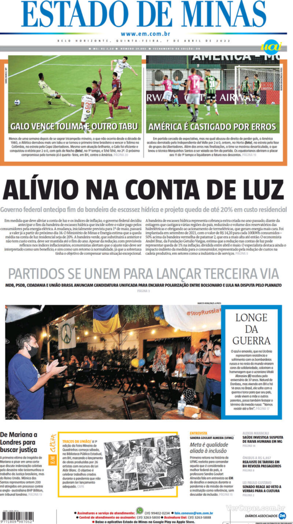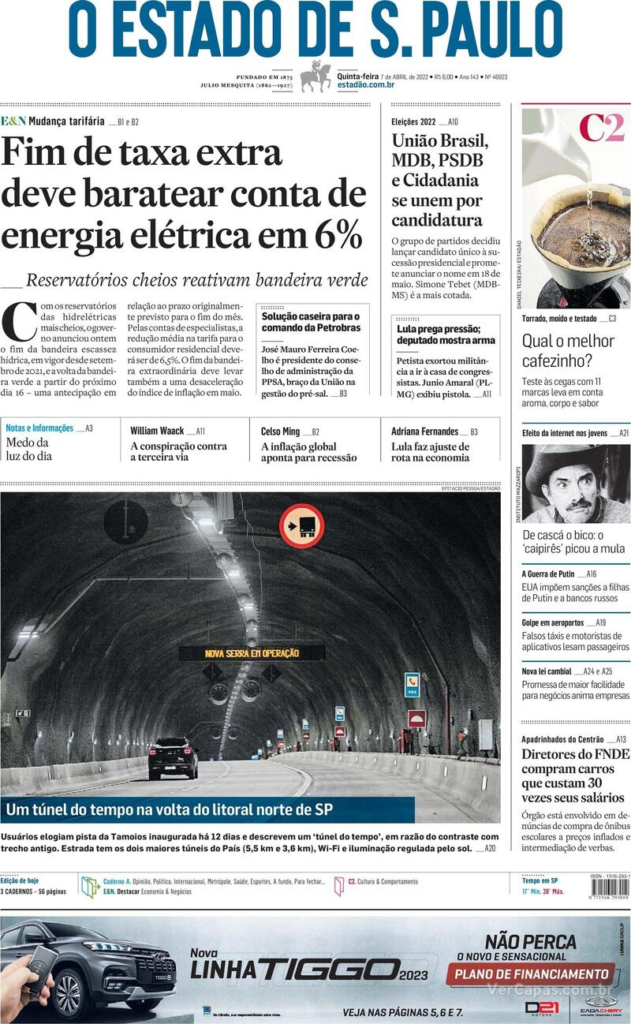 O Estadão destaca a queda da taxa extra sobre energia elétrica, que pode reduzir a conta de luz em 6% a partir de maio.