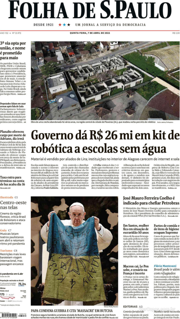 A Folha de São Paulo nesta quinta-feira traz mais uma manchete sobre o uso questionável de verbas públicas, através das chamadas ‘emendas do relator’. A notícia cita o presidente da Câmara, Arthur Lira (PP-AL) na distribuição de kits de robótica para escolas em Alagoas, que sequer têm água.