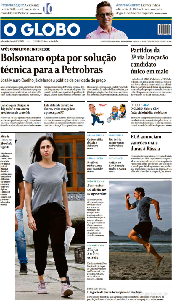 Os jornais destacam a decisão de alguns dos maiores partidos (União Brasil, MDB, PSDB e Cidadania) de buscarem um nome único para a disputa presidencial. O nome será anunciado em maio.