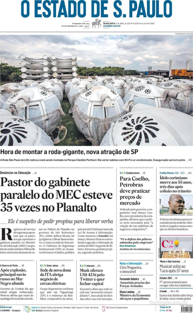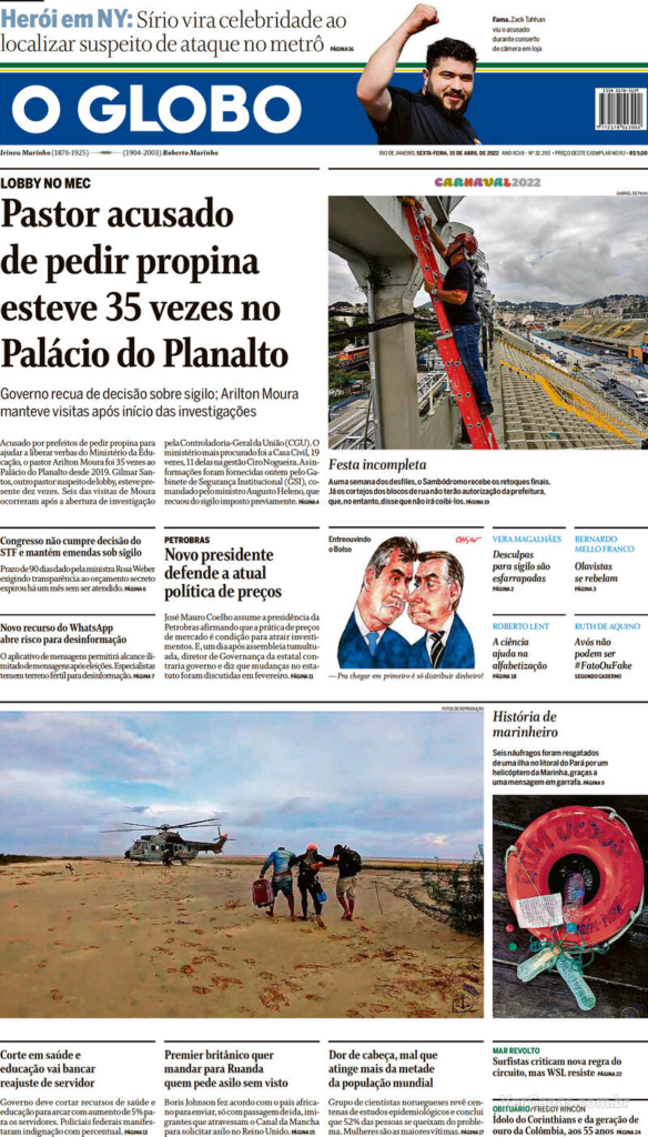 1. O governo cedeu e divulgou as visitas do pastor envolvido na cobrança de propina para liberar dinheiro do MEC e o assunto é um dos principais destaques dos jornais desta sexta-feira santa.