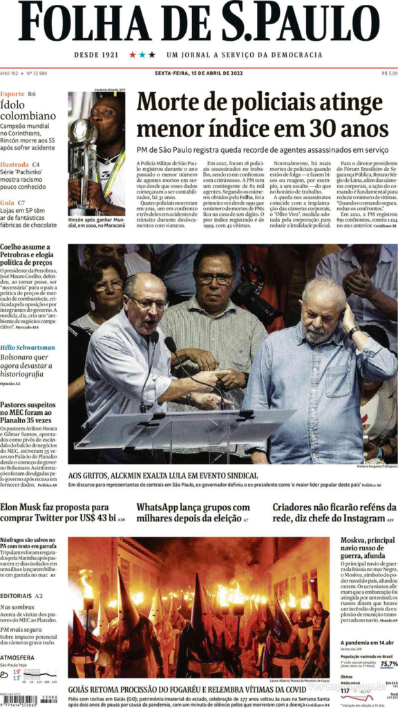 5. A Folha traz destaque do ex-governador de São Paulo, Geraldo Alckmin – indicado a vice na chapa liderada por Lula. De forma entusiasmada, ele defendeu o companheiro de chapa.