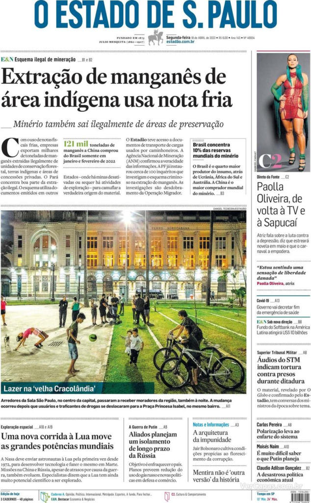 As manchetes dos jornais estão diversificadas. O Estadão chama a atenção para a exploração de manganês em áreas indígenas, com o uso de nota fiscal fria, mostrando que a ilegalidade predomina na atividade na região.