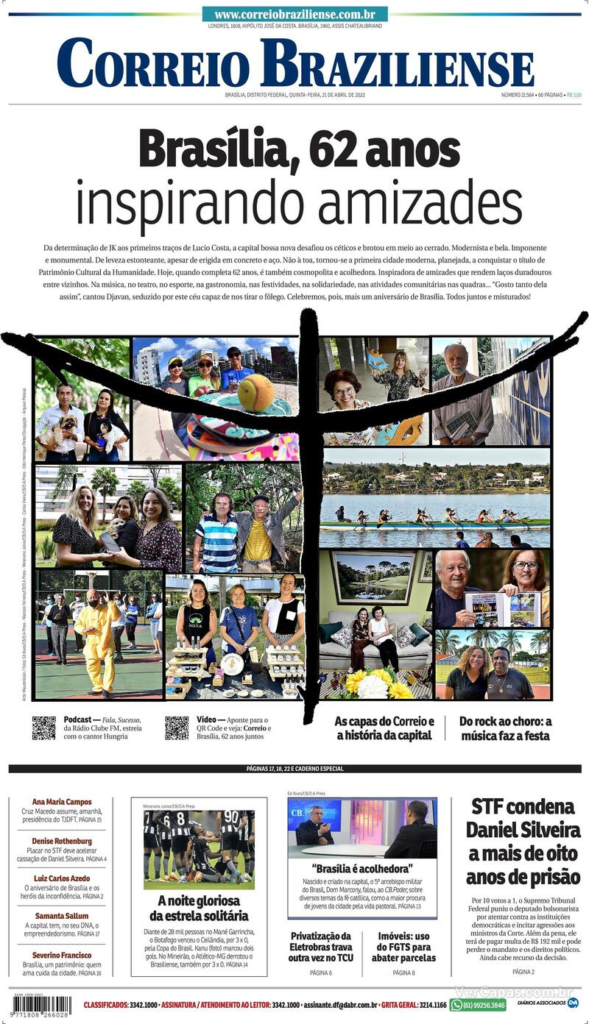 O Correio Braziliense traz manchete lembrando os 62 anos de fundação de Brasília.