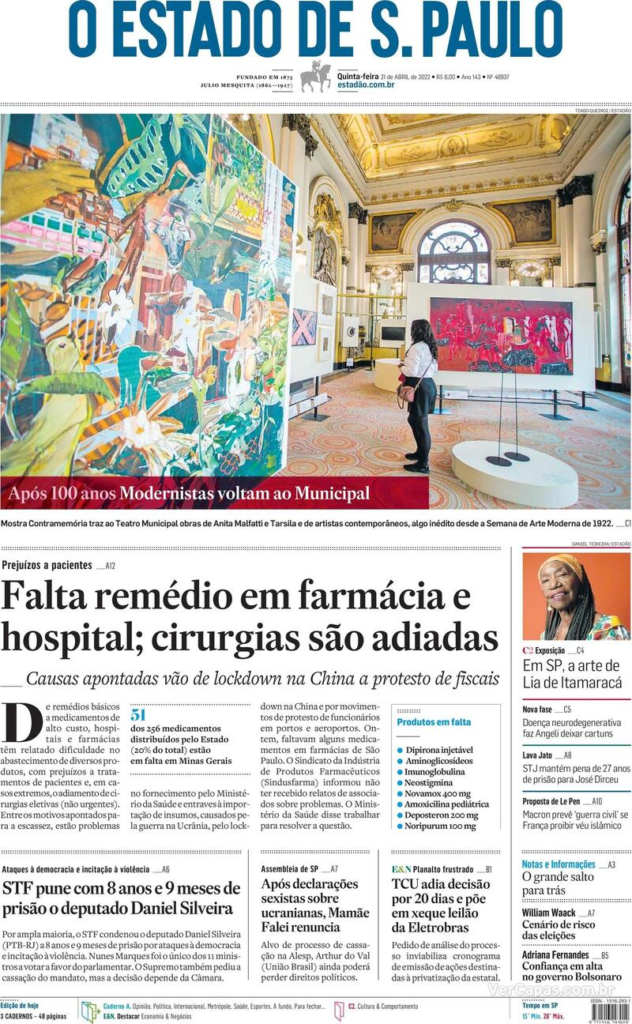 O Estadão traz destaque para a falta de remédios nas farmácias e hospitais. As causas seriam as operações padrão dos fiscais federais e o lockdown na China.
