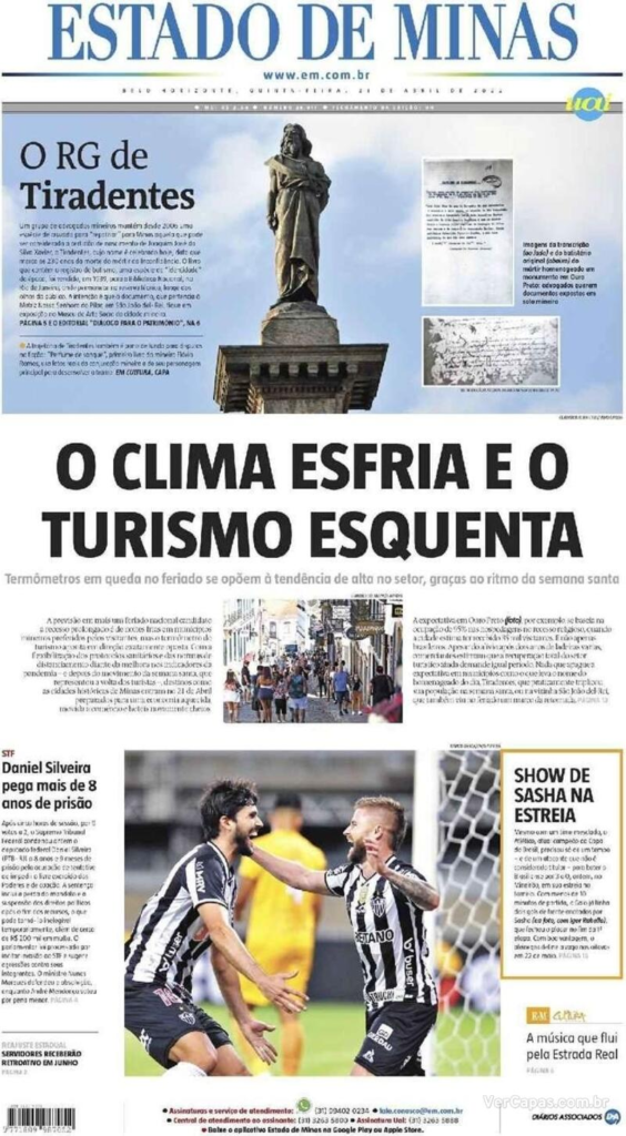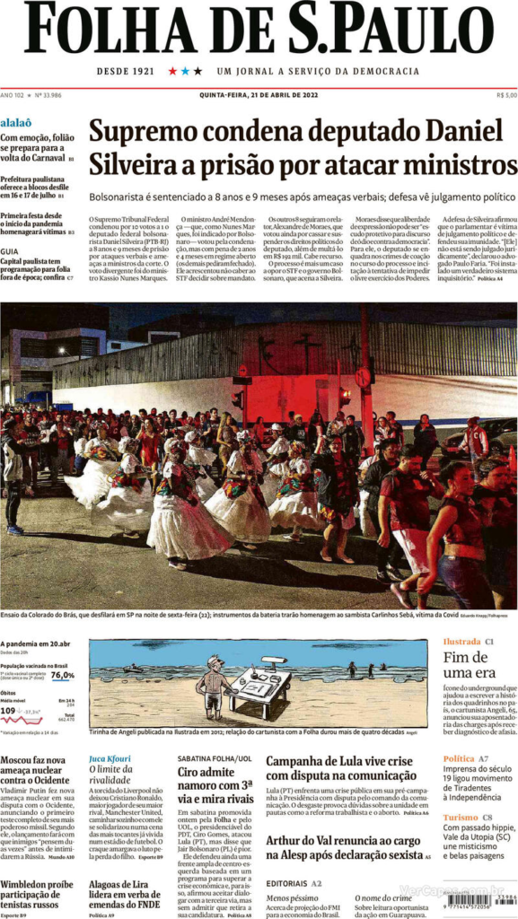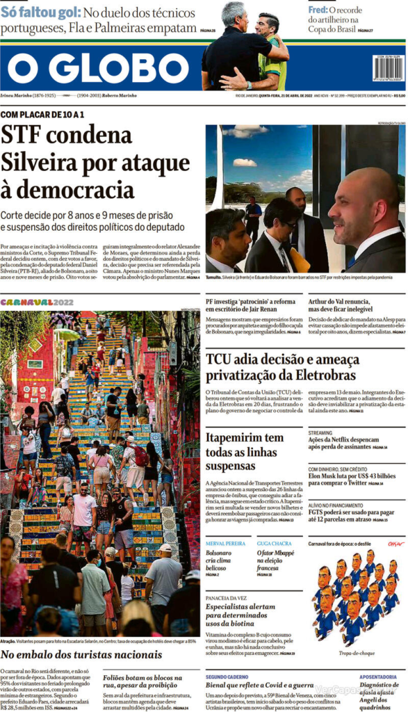 Os jornais desta quinta-feira de feriado destacam a decisão do STF de condenar o deputado Daniel Silveira (PL-RJ) à prisão por 10×1. A decisão deve irritar os bolsonaristas e é possível que surjam manifestações contrárias ao tribunal.