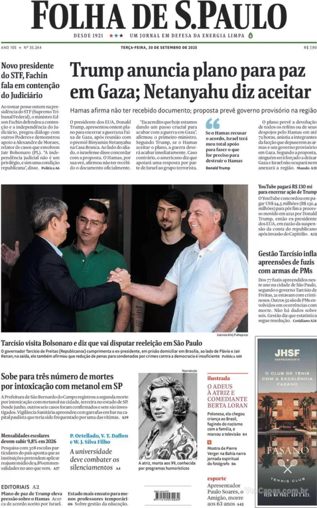 As negociações para a paz no Oriente Médio é outro assunto com grande destaque nos jornais. O plano foi anunciado pelo presidente dos Estados Unidos, Donald Trump, ao lado do primeiro-ministro de Israel, Benjamin Netanyahu. Pelo plano, o Hammas tem de concordar com o seu desarmamento.