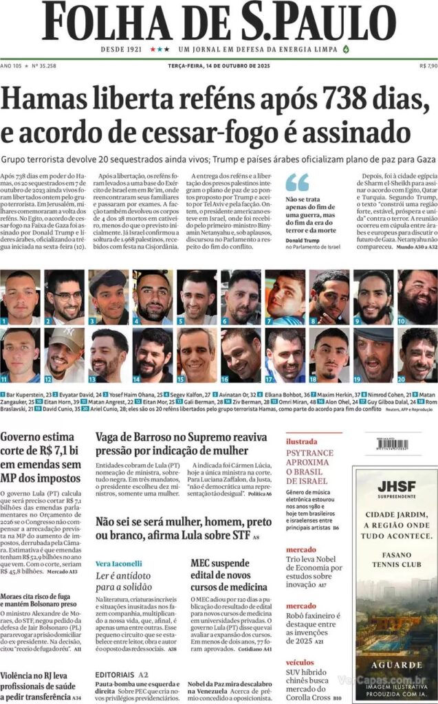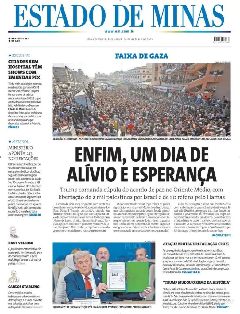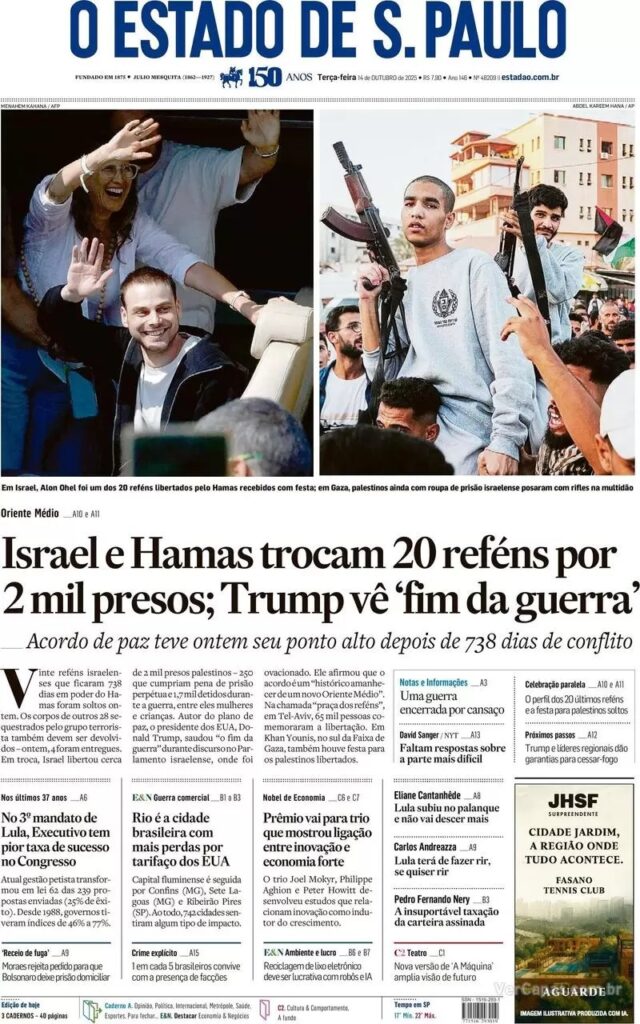 Uma das questões em aberto é quanto à administração da região conhecida como Faixa de Gaza, que abriga cerca de dois milhões de pessoas. Países da Comunidade Europeia devem participar da administração da região, mas não se sabe se o Hamas vai se desarmar. O Estado de S. Paulo divulga foto de um militante armado desfilando na região.