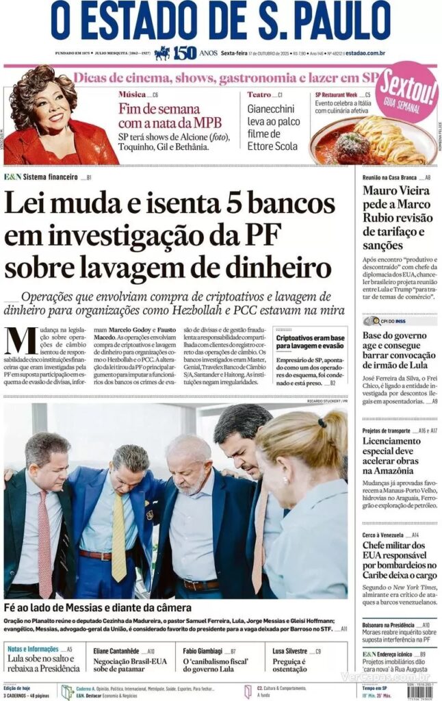 O Estado de S. Paulo destaca que mudanças em lei beneficiam cinco bancos, que teriam sido isentados de investigação da Polícia Federal sobre lavagem de dinheiro.