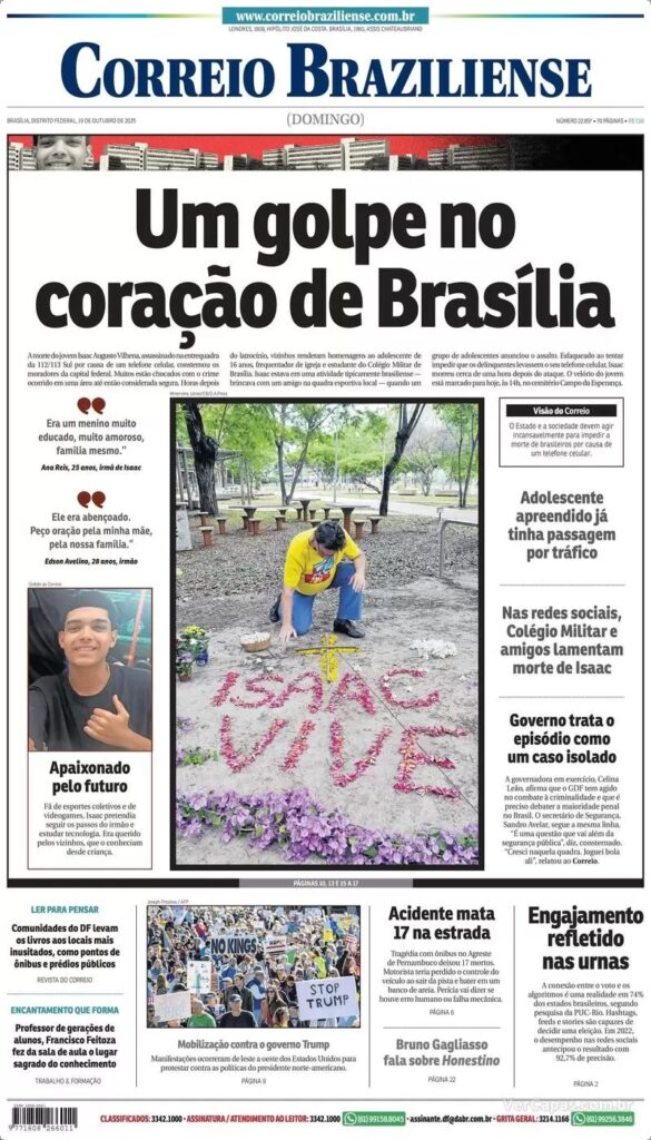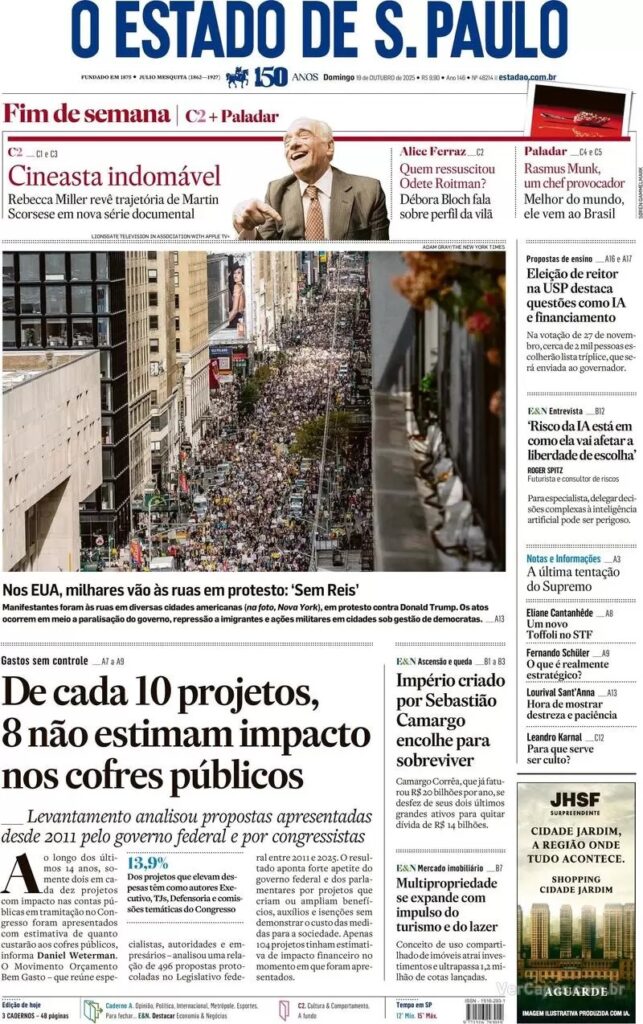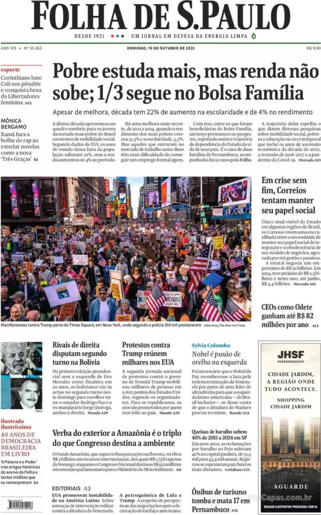 4. Na área internacional, os jornais destacam os grandes protestos nos Estados Unidos contra o presidente Donald Trump. Foram realizadas manifestações de protestos em dezenas de cidades americanas.