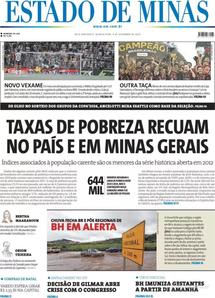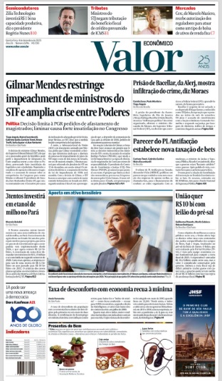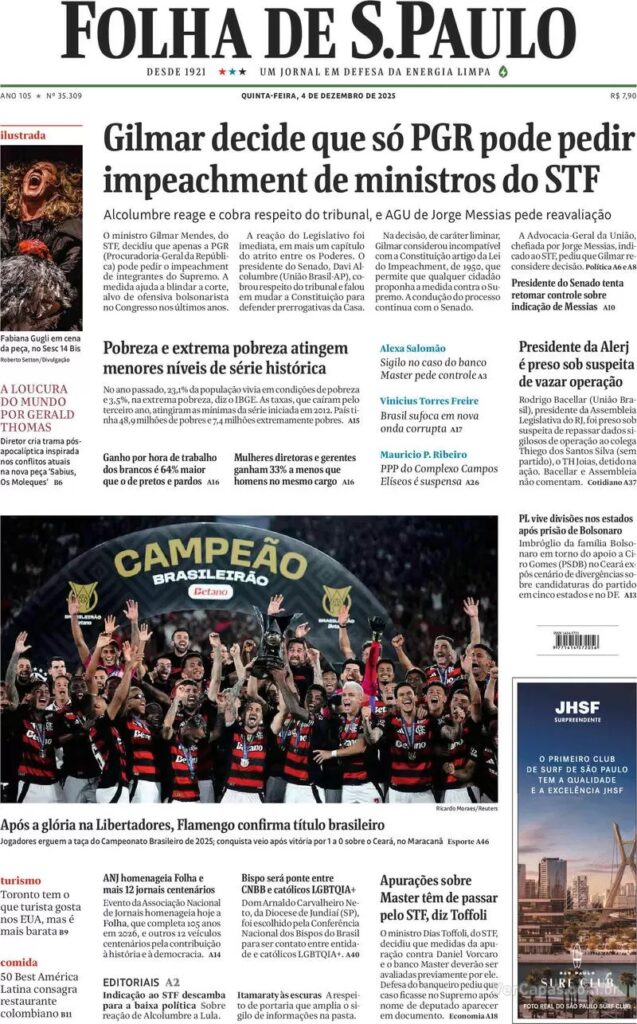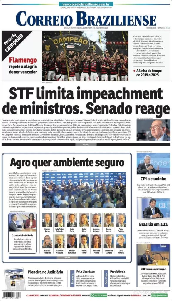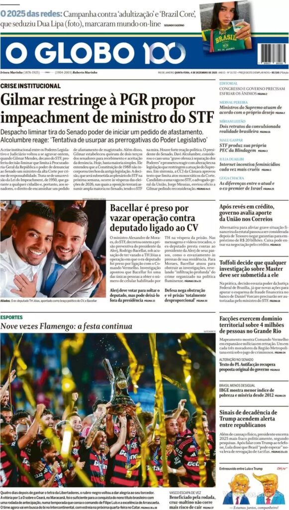 1. O ministro do Supremo Tribunal Federal, Gilmar Mendes, ampliou o conflito com o Legislativo ao decidir, de forma monocromática, que só a Procuradoria Geral da República (PGR) pode pedir o impeachment de ministros da casa. O assunto é o principal destaque dos jornais desta quinta-feira.
