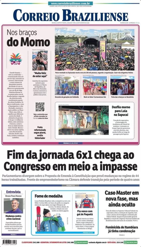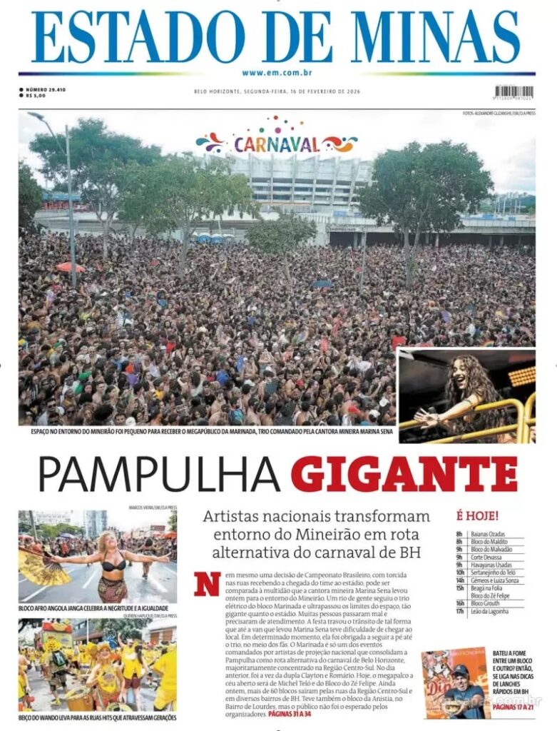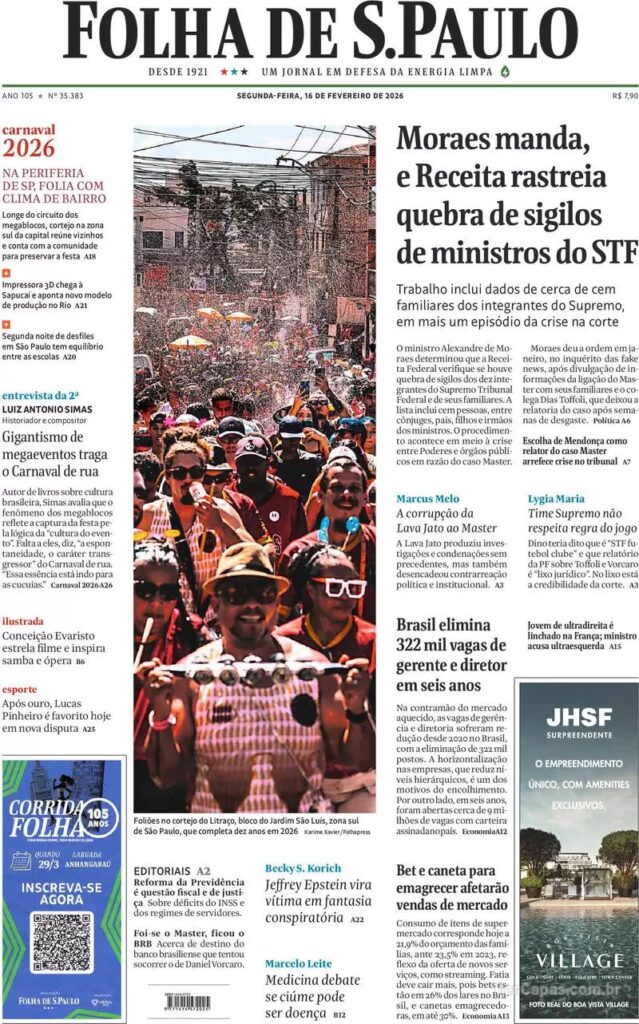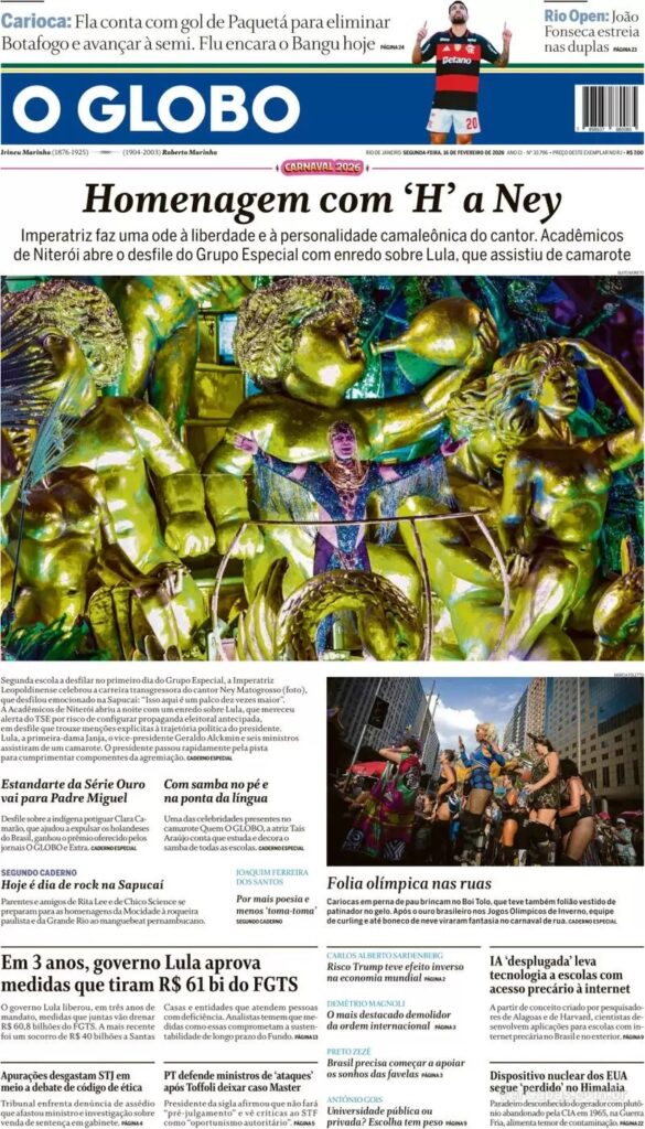 O jornal O Estado de S. Paulo dá como manchete que o presidente Lula participou do desfile das escolas de samba no Rio, apesar de alertas do TSE sobre o possível uso como propaganda eleitoral. Lula visitou a escola, antes de sua entrada na avenida. A primeira-dama, Janja, desistiu de desfilar no carro alegórico.