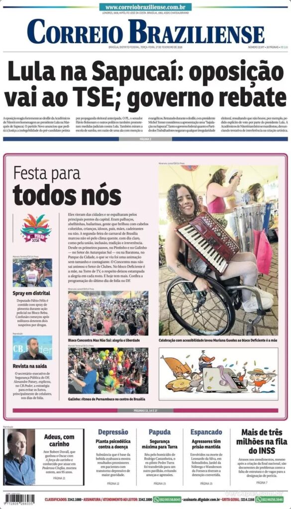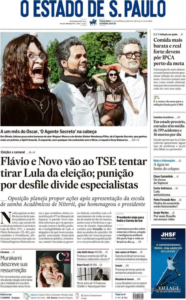 A homenagem ao presidente Lula no Carnaval do Rio de Janeiro continua sendo destacada pelos jornais. O Estado de S. Paulo dá como manchete de que a participação do presidente pode configurar crime eleitoral por propaganda antecipada.
