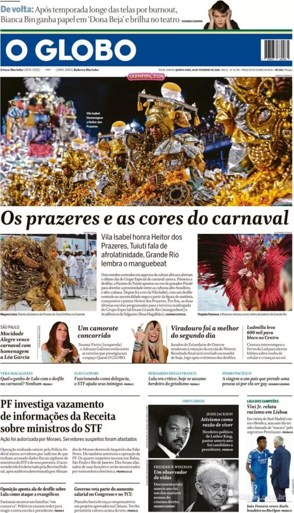 Os desdobramentos políticos da homenagem à Lula no desfile das escolas de samba no Rio de Janeiro tende a continuar nos próximos dias, especialmente após a volta das atividades parlamentares mais intensas, a partir da semana que vem. O assunto é controverso e a Folha de S. Paulo lembra que o PT acionou a Justiça eleitoral contra candidados do PSDB na campanha de 2006.