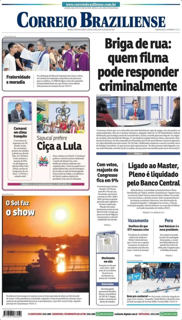 Os jornais continuam dando destaque aos desdobramentos políticos da homenagem que a escola de samba Acadêmicos de Niterói prestou ao presidente Lula. Frentes parlamentares ligadas aos evangélicos e aos católicos criticaram a forma como a escola retratou as duas religiões durante o desfile. Devido a problemas técnicos, a escola foi rebaixada do bloco de elite do Carnaval carioca.
