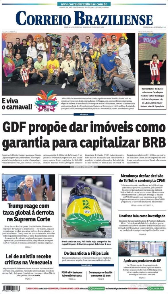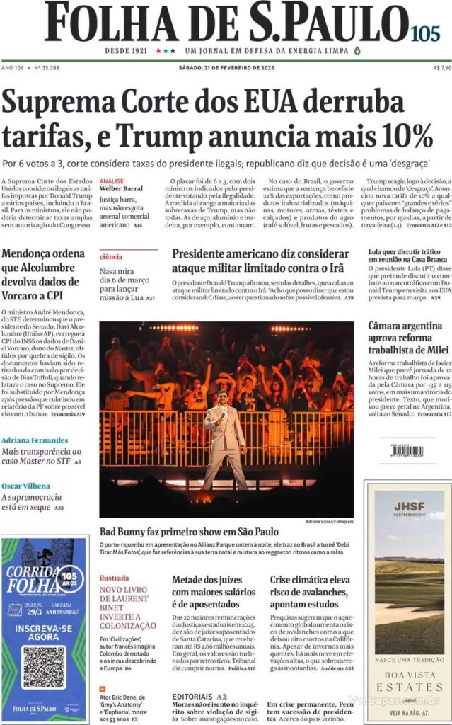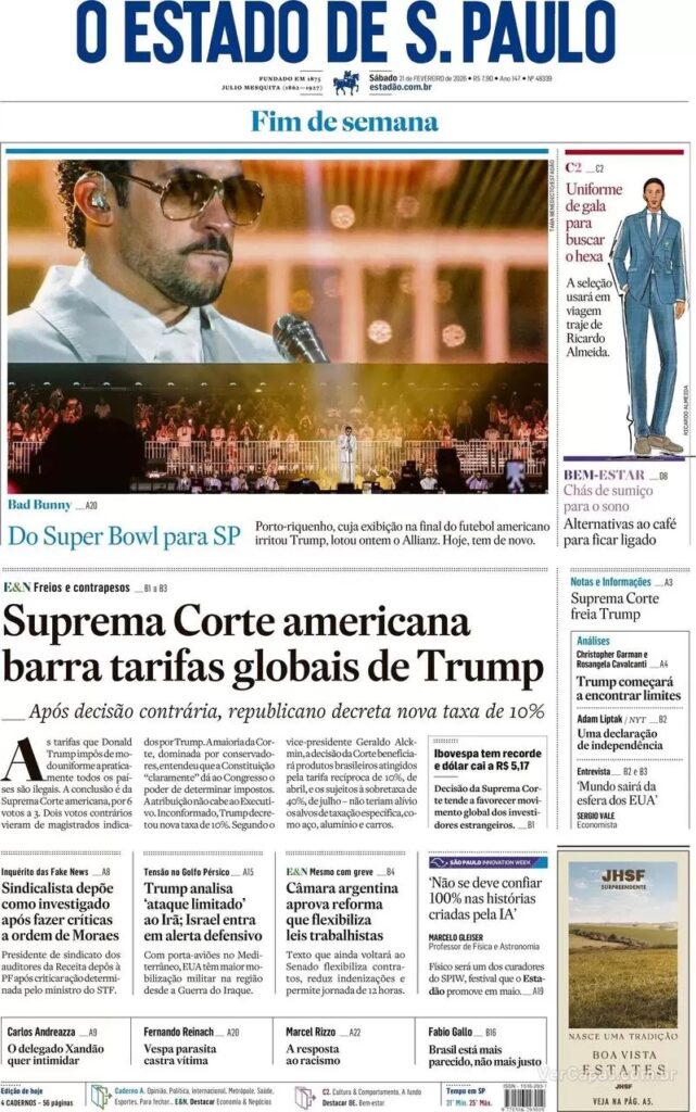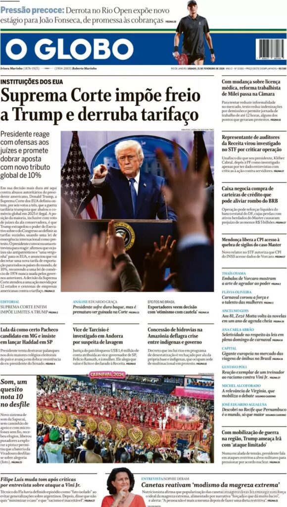 A decisão da Suprema Corte dos Estados Unidos de derrubar as tarifas de importação impostas pelo presidente Donald Trump é o principal destaque dos jornais deste sábado. Por 6×3 a Suprema Corte considera que as tarifas são ‘impostos’ e só poderiam ser aprovadas pelo Congresso dos Estados Unidos.