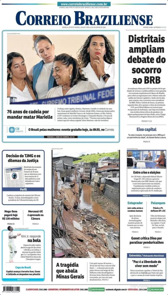 A condenação dos irmãos Brazão pelo assassinato da vereadora Marielle Franco, do Rio de Janeiro, é o principal destaque dos jornais desta quinta-feira. Influentes na política fluminense, os Brazão foram condenados a 76 anos de prisão.