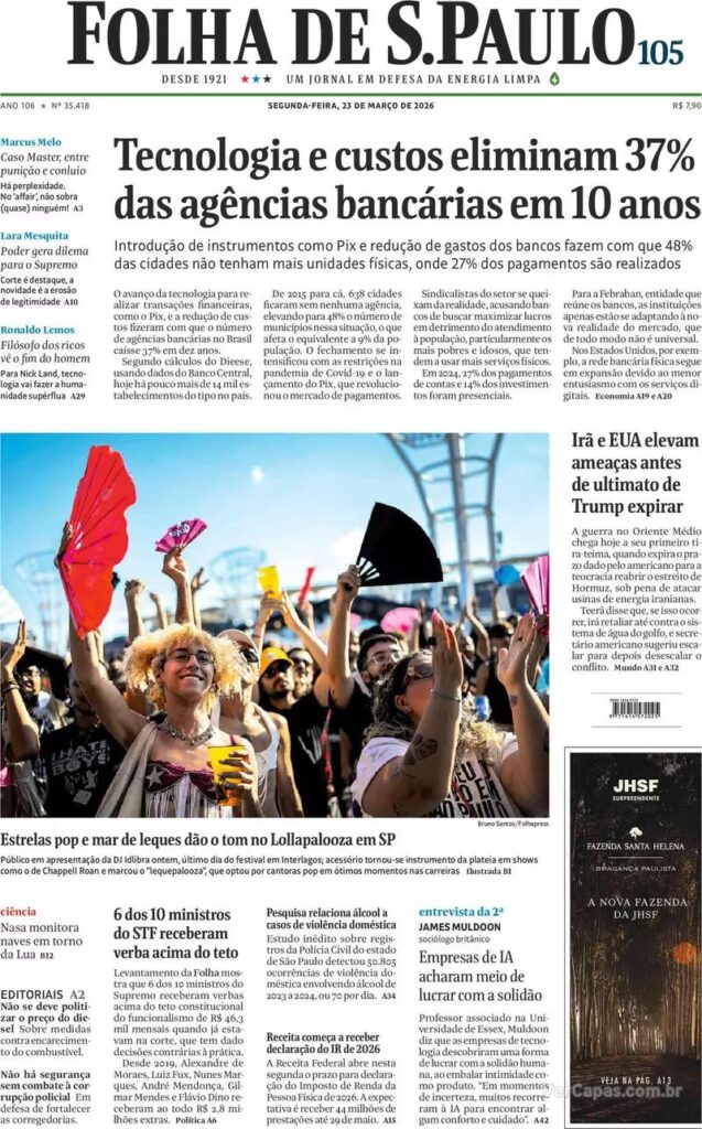 5. A Folha de S. Paulo, por sua vez, traz amplo levantamento sobre o fechamento de agências bancárias no país. O avanço da tecnologia e o aumento dos custos eliminam 37% das agências bancárias brasileiras em 10 anos.