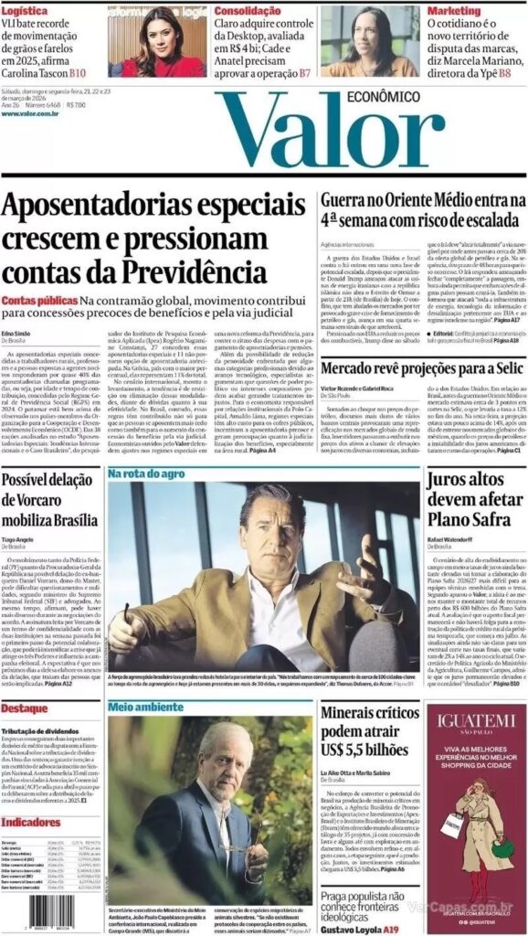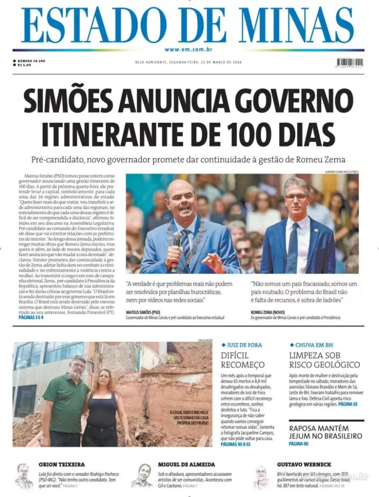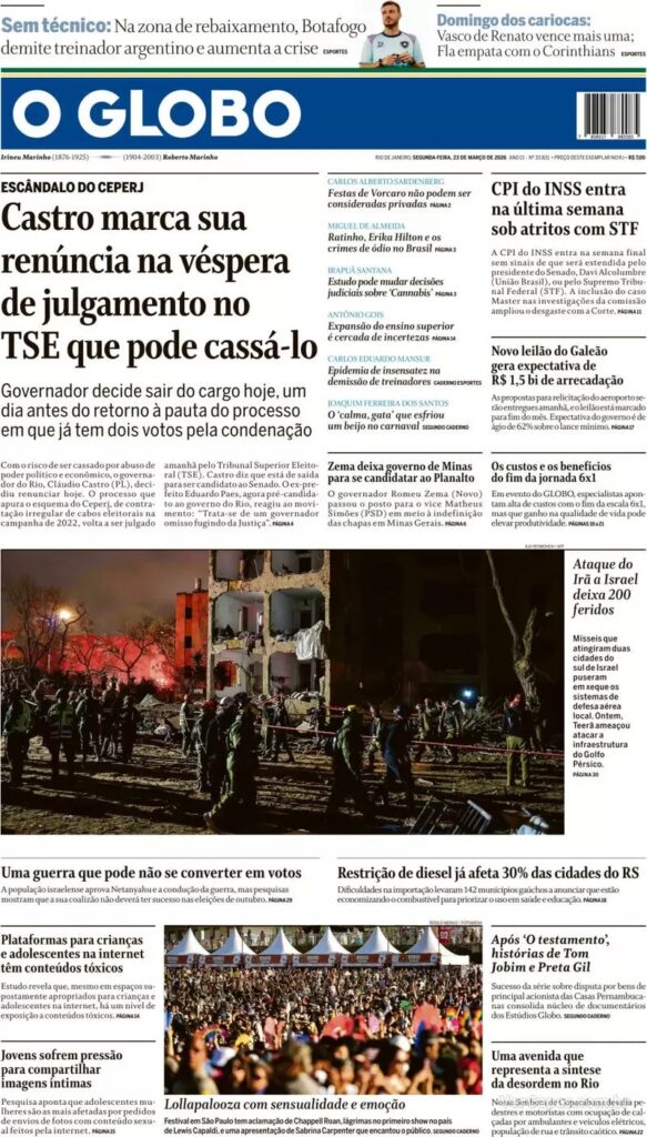 6. Na política, O Globo destaca a provável renúncia do governador do Rio de Janeiro, Cláudio Castro. O TSE está na fase final do julgamento e ele teme ser cassado. Para evitar perder os direitos políticos – e poder disputar as novas eleições – Castro teria optado pela renúncia antecipada ao cargo.