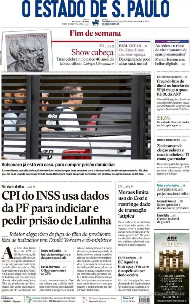A CPMI para investigar irregularidades nos descontos indevidos de aposentados e pensionistas está chegando ao fim, com troca de acusações entre o governo e oposição, conforme destacam os jornais deste sábado. Os governistas querem envolver Bolsonaro nas irregularidades e a oposição quer convocar o filho do presidente Lula para depor no processo. A CPMI deverá ter dois relatórios finais.