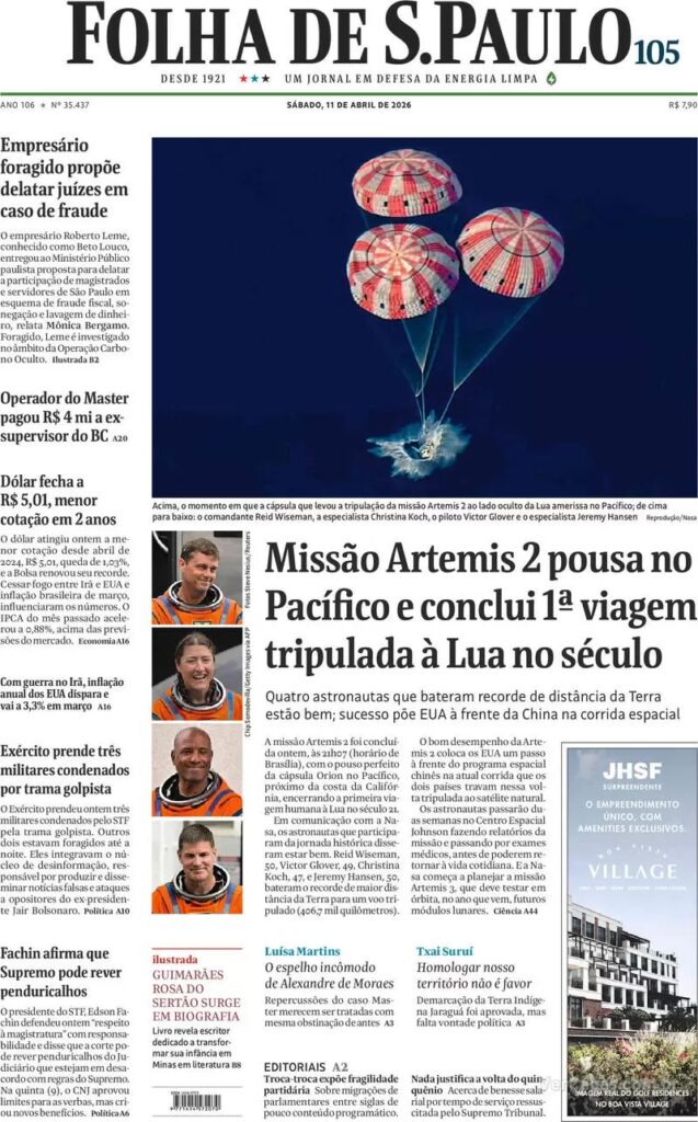 A tripulação da nave espacial Artemis II retornou à terra em vôo bem sucedido. Os jornais destacam o feito e trazem reportagens sobre a retomada do programa espacial americano, após quase cinco décadas de baixos investimentos no setor. O Globo faz levantamento sobre os beneficios que os programas espaciais trouxeram como internet mais rápida e novos medicamentos.