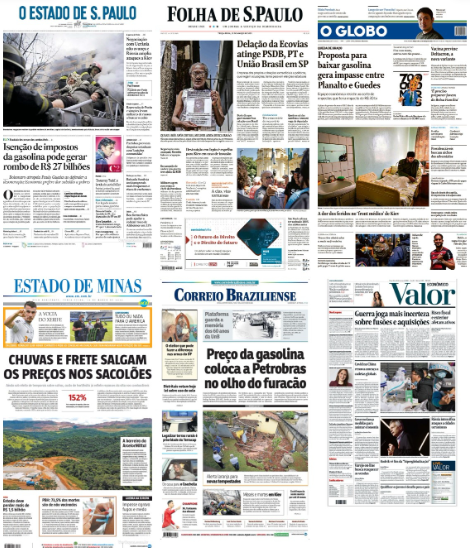 1. As manchetes dos principais jornais do país chamam para assuntos locais, nesta terça-feira. A Folha fala sobre delação da Ecovias, que pode atingir PSDB, PT e União Brasil em São Paulo. O Estadão e o Globo trazem informações sobre a queda de braço no governo quanto ao subsídio aos combustíveis.