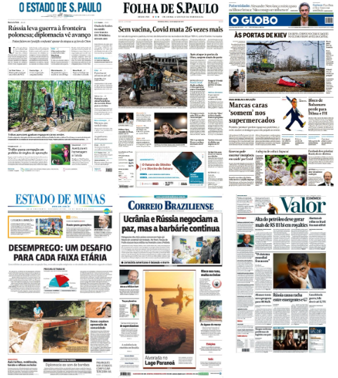 1. As capas dos jornais desta quarta-feira dão mais peso a questões internas do que à guerra na Ucrânia, mas que continua presente. A Folha traz uma foto de destruição provocada por ataques russos e O Globo traz o nascimento de uma criança naquele país, como símbolo de esperança.
