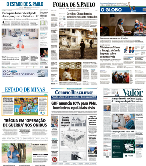 4. O Estadão destaca a polêmica sobre os preços dos combustíveis. Bolsonaro continua insistindo que a Petrobras deve baixar os preços, mas o ministro de Minas e Energia, Bento Albuquerque disse que vai manter o presidente da estatal. Ele quer novo imposto sobre os combustíveis, como destaca O Globo.