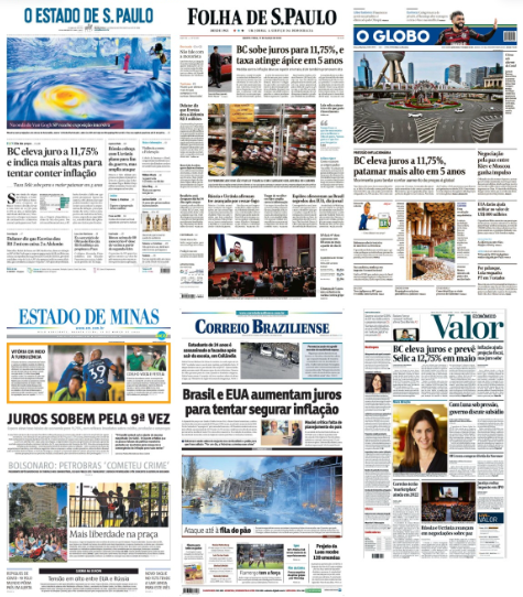 1. A elevação dos juros pelo Banco Central domina as capas dos jornais nesta quinta-feira. Foi a nona alta consecutiva e deve ser seguida por um novo aumento em maio, quando deverá atingir 12,75% ao ano. Ficou em 11,75%, com aumento de 1 pp.