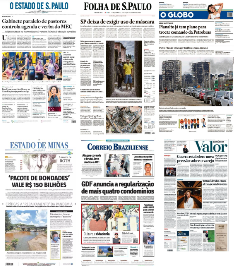 5. Na política, os jornais destacam a recuperação de Bolsonaro nas pesquisas eleitorais, mas ainda distante do líder, Lula. A ‘terceira via’, com Ciro e Moro permanece em cerca de 7%.