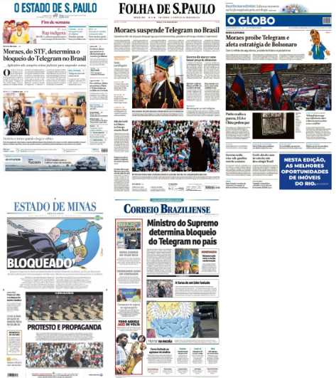 1. A suspensão da plataforma Telegram no Brasil pelo juiz Alexandre de Moraes, do STF, está na manchete dos principais jornais do país neste sábado.