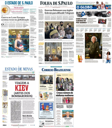 1. Os jornais trazem chamadas diferenciadas nestes domingo. A guerra da Ucrânia permanece como assunto principal, mas os jornais destacam outras ‘guerras’ de Bolsonaro. Após a questão dos combustíveis, a preocupação do presidente agora é quanto às restrições à plataforma Telegram.