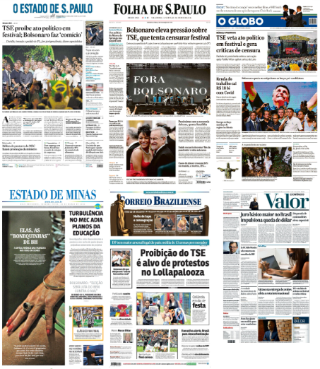 1. As eleições invadiram os shows e o mundo artístico, como destacam os jornais nesta segunda-feira. A decisão do TSE de proibir manifestações políticas no festival Lollapalooza surtiu efeito inverso ao desejado pelo PL, que entrou com pedido contra manifestações políticas no festival. Por erro processual, o pedido do PL chegou atrasado e os organizadores não impediram a manifestação.