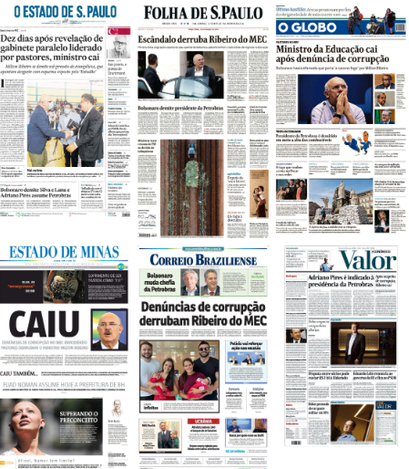 1. A queda do ministro da Educação, Milton Ribeiro, está na capa dos principais jornais do país nesta terça-feira. O ministro não resistiu ao escândalo dos pastores evangélicos que transformaram o ministério em um balcão de negócios intermediando verbas para as prefeituras. Bolsonaro teria optado por nomear o secretário-executivo como ministro. Líderes políticos começaram a veicular possíveis substitutos.