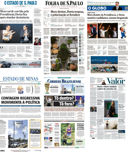 1. As idas e vindas dos presidenciáveis Sérgio Moro e João Dória estão nas capas dos jornais deste sábado. Moro teria ‘desistido de desistir’ e disse que continua no páreo. Ala do União Brasil, novo partido do ex-juiz, é contra esse objetivo.